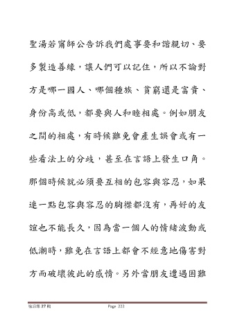 聖湯若甯師公告訴我們處事要和諧親切、要 多製造善緣,讓人們可以記住,所以不論對 方是哪一國人、哪個種族、貧窮還是富貴、 身份高或低,都要與人和睦相處。例如朋友 之間的相處,有時候難免會產生誤會或有一 些看法上的分歧,甚至在言語上發生口角。 那個時候就必須要互相的包容與容忍,如果 連一點包容與容忍的胸襟都沒有,再好的友 誼也不能長久,因為當一個人的情緒波動或 低潮時,難免在言語上都會不經意地傷害對 方而破壞彼此的感情。另外當朋友遭遇困難 嗆浪集 27 輯 Page 222