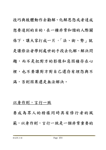 技巧與肢體動作去勸解、化解恩怨或者達成 想要達到的目的,在一種非常和諧的人際關 係下,讓大家打成一片。「法、術、勢」就 是讓修法者學到處世的手段去化解、解決問 題,而不是把對方的影像和惡因積存在心 裡,也不要讓對方對自己還存有埋怨與不 滿,否則因果還是無法解決。 以身作則,言行一致 要成為眾人的榜樣同時具有修行者的風 範,以身作則,言行一致是一個非常重要的 嗆浪集 29 輯 Page 154