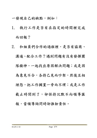 一發現自己的缺點,例如: 1. 執行工作是否有在指定的時間裡完成 而回報? 2. 和組員們合作的過程裡,是否有協商、 溝通、配合工作?遇到問題有沒有發揮團 隊精神,一起找出原因解決問題;或是因 為意見不合,各持己見而吵架,然後互相 埋怨,把工作擱置一旁而不理;或是工作 截止時間到了,卻保持沉默不向領導匯 報,當領導詢問時卻推卸責任。 嗆浪集 29 輯 Page 179