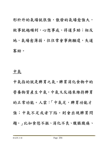 形於外的氣場就很強,散發的氣場愈強大, 做事就越順利,心想事成、得道多助;相反 地,氣場愈薄弱,往往常會事與願違,失道 寡助。 中氣 中氣指的就是脾胃之氣。脾胃消化食物中的 營養物質產生中氣,中氣又反過來維持脾胃 的正常功能。人雲:「中氣足,脾胃功能才 強;中氣不足或者下陷,則會出現脾胃問 題。」比如食慾不振、消化不良、腹脹腹痛、 嗆浪集 29 輯 Page 256