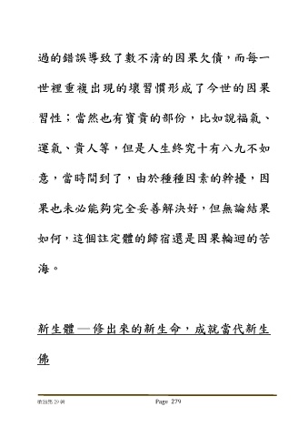 過的錯誤導致了數不清的因果欠債,而每一 世裡重複出現的壞習慣形成了今世的因果 習性;當然也有寶貴的部份,比如說福氣、 運氣、貴人等,但是人生終究十有八九不如 意,當時間到了,由於種種因素的幹擾,因 果也未必能夠完全妥善解決好,但無論結果 如何,這個註定體的歸宿還是因果輪迴的苦 海。 新生體 修出來的新生命,成就當代新生 佛 嗆浪集 29 輯 Page 279
