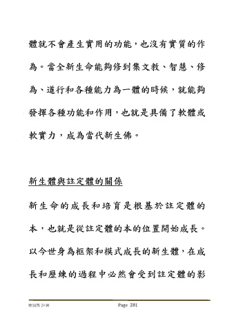 體就不會產生實用的功能,也沒有實質的作 為。當全新生命能夠修到集文教、智慧、修 為、道行和各種能力為一體的時候,就能夠 發揮各種功能和作用,也就是具備了軟體或 軟實力,成為當代新生佛。 新生體與註定體的關係 新生命的成長和培育是根基於註定體的 本,也就是從註定體的本的位置開始成長。 以今世身為框架和模式成長的新生體,在成 長和歷練的過程中必然會受到註定體的影 嗆浪集 29 輯 Page 281