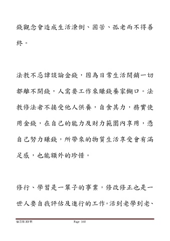 錢觀念會造成生活潦倒、困苦、孤老而不得善 終。 法教不忌諱談論金錢,因為日常生活開銷一切 都離不開錢,人需要工作來賺錢養家餬口。法 教修法者不接受他人供養,自食其力,務實使 用金錢,在自己的能力及財力範圍內享用,憑 自己努力賺錢,所帶來的物質生活享受會有滿 足感,也能額外的珍惜。 修行、學習是一輩子的事業,修改修正也是一 世人要自我評估及進行的工作。活到老學到老、 嗆浪集 33 輯 Page 168