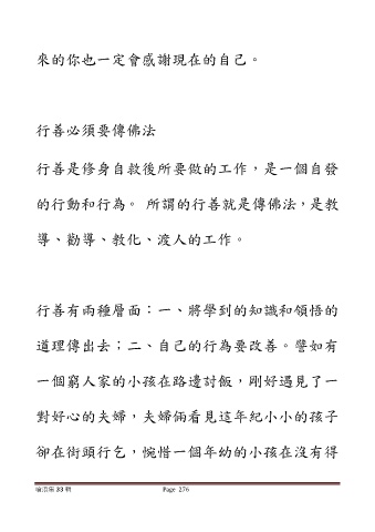 來的你也一定會感謝現在的自己。 行善必須要傳佛法 行善是修身自救後所要做的工作,是一個自發 的行動和行為。 所謂的行善就是傳佛法,是教 導、勸導、教化、渡人的工作。 行善有兩種層面:一、將學到的知識和領悟的 道理傳出去;二、自己的行為要改善。譬如有 一個窮人家的小孩在路邊討飯,剛好遇見了一 對好心的夫婦,夫婦倆看見這年紀小小的孩子 卻在街頭行乞,惋惜一個年幼的小孩在沒有得 嗆浪集 33 輯 Page 276