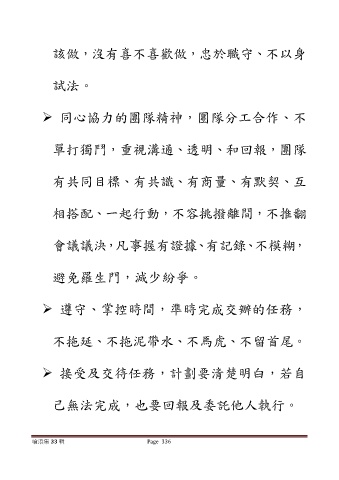 該做,沒有喜不喜歡做,忠於職守、不以身 試法。 ➢ 同心協力的團隊精神,團隊分工合作、不 單打獨鬥,重視溝通、透明、和回報,團隊 有共同目標、有共識、有商量、有默契、互 相搭配、一起行動,不容挑撥離間,不推翻 會議議決,凡事握有證據、有記錄、不模糊, 避免羅生門,減少紛爭。 ➢ 遵守、掌控時間,準時完成交辦的任務, 不拖延、不拖泥帶水、不馬虎、不留首尾。 ➢ 接受及交待任務,計劃要清楚明白,若自 己無法完成,也要回報及委託他人執行。 嗆浪集 33 輯 Page 336