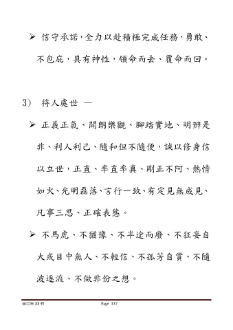 ➢ 信守承諾,全力以赴積極完成任務,勇敢、 不包庇,具有神性,領命而去、覆命而回。 3) 待人處世 — ➢ 正義正氣、開朗樂觀、腳踏實地、明辨是 非、利人利己、隨和但不隨便,誠以修身信 以立世,正直、率直率真、剛正不阿、熱情 如火、光明磊落、言行一致、有定見無成見、 凡事三思、正確表態。 ➢ 不馬虎、不猶豫、不半途而廢、不狂妄自 大或目中無人、不輕信、不孤芳自賞、不隨 波逐流、不做非份之想。 嗆浪集 33 輯 Page 337