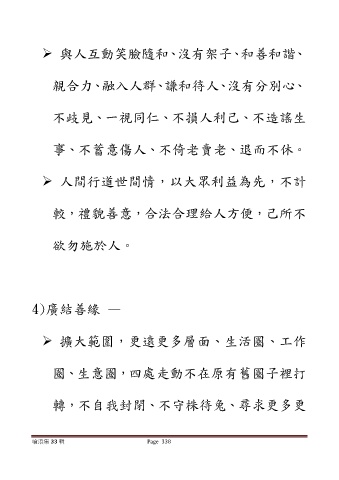 ➢ 與人互動笑臉隨和、沒有架子、和善和諧、 親合力、融入人群、謙和待人、沒有分別心、 不歧見、一視同仁、不損人利己、不造謠生 事、不蓄意傷人、不倚老賣老、退而不休。 ➢ 人間行道世間情,以大眾利益為先,不計 較,禮貌善意,合法合理給人方便,己所不 欲勿施於人。 4) 廣結善緣 — ➢ 擴大範圍,更遠更多層面、生活圈、工作 圈、生意圈,四處走動不在原有舊圈子裡打 轉,不自我封閉、不守株待兔、尋求更多更 嗆浪集 33 輯 Page 338