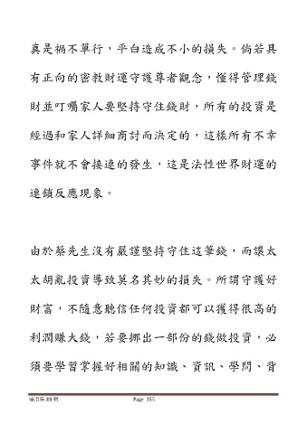真是禍不單行,平白造成不小的損失。倘若具 有正向的密教財運守護尊者觀念,懂得管理錢 財並叮囑家人要堅持守住錢財,所有的投資是 經過和家人詳細商討而決定的,這樣所有不幸 事件就不會接連的發生,這是法性世界財運的 連鎖反應現象。 由於蔡先生沒有嚴謹堅持守住這筆錢,而讓太 太胡亂投資導致莫名其妙的損失。所謂守護好 財富,不隨意聽信任何投資都可以獲得很高的 利潤賺大錢,若要挪出一部份的錢做投資,必 須要學習掌握好相關的知識、資訊、學問、背 嗆浪集 33 輯 Page 355