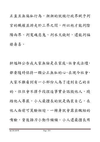 正直且無偏私行為,漸漸的就被行政界賦予判 官的職權並游走於三界之間,所以祂才能判陰 陽兩界、判寃魂惡鬼、判水火錢財,還能判福 祿壽喜。 鈡馗師公告戒大家無論是在家庭、社會或法壇, 都要隨時保持一顆公正無私的心。在現今社會, 大家不難看到有一小部份人為了達到自己的目 的,往往會不擇手段捏造事實去詆毀他人,踐 踏他人尊嚴,小人最擅長的就是偽裝自己,在 他人面前可笑臉相迎,一轉身就會露出醜陋的 嘴臉,背後插刀小動作頻頻。小人還最擅長用 嗆浪集 33 輯 Page 359