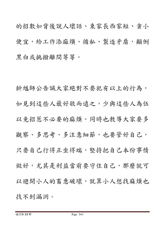的招數如背後說人壞話、東家長西家短、貪小 便宜,給工作添麻煩、循私、製造矛盾,顛倒 黑白或挑撥離間等等。 鈡馗師公告誡大家絕對不要犯有以上的行為, 如見到這些人最好敬而遠之,少與這些人為伍 以免招惹不必要的麻煩。同時也教導大家要多 觀察、多思考、多注意細節,也要管好自己, 只要自己行得正坐得端,堅持把自己本份事情 做好,尤其是利益當前要守住自己,那麼就可 以避開小人的畜意破壞,就算小人想找麻煩也 找不到漏洞。 嗆浪集 33 輯 Page 360