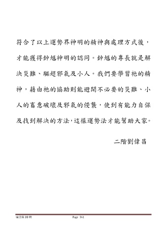 符合了以上運勢界神明的精神與處理方式後, 才能獲得鈡馗神明的認同。鈡馗的專長就是解 決災難、驅趕邪氣及小人。我們要學習祂的精 神,藉由祂的協助則能避開不必要的災難、小 人的畜意破壞及邪氣的侵襲,使到有能力自保 及找到解決的方法,這樣運勢法才能幫助大家。 二階劉偉昌 嗆浪集 33 輯 Page 361