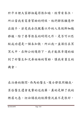 於平日裡大家都相處得很和睦,經常有來往, 所以當我有需要幫助的時候,他們都很願意伸 出援手。若是我去找親屬以外的人來做幹細胞 移植,除了要等很長的時間之外,是否可以匹 配成功還是一個未知數。所以我一直深信在冥 冥之中,在師公的護持下,我才能很幸運的碰 到了好醫生和兄弟姐妹的幫助,讓我有重生的 機會。 在治療的期間,西馬的醫生、護士都很照顧我, 某些醫生還會免費的送我藥,真的是解了我的 燃眉之急。坦白講我的經濟情況並不是很好, 嗆浪集 33 輯 Page 366