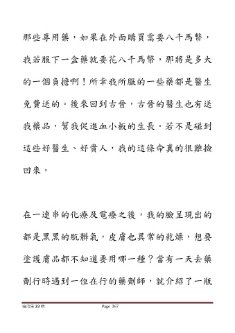 那些專用藥,如果在外面購買需要八千馬幣, 我若服下一盒藥就要花八千馬幣,那將是多大 的一個負擔啊!所幸我所服的一些藥都是醫生 免費送的。後來回到古晉,古晉的醫生也有送 我藥品,幫我促進血小板的生長。若不是碰到 這些好醫生、好貴人,我的這條命真的很難撿 回來。 在一連串的化療及電療之後,我的臉呈現出的 都是黑黑的肮髒氣,皮膚也異常的乾燥,想要 塗護膚品都不知道要用哪一種?當有一天去藥 劑行時遇到一位在行的藥劑師,就介紹了一瓶 嗆浪集 33 輯 Page 367