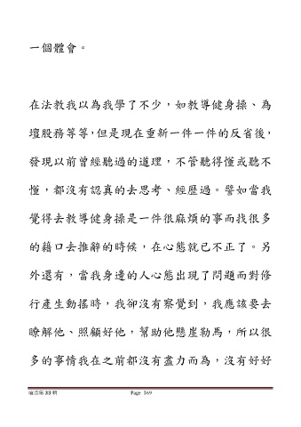 一個體會。 在法教我以為我學了不少,如教導健身操、為 壇股務等等,但是現在重新一件一件的反省後, 發現以前曾經聽過的道理,不管聽得懂或聽不 懂,都沒有認真的去思考、經歷過。譬如當我 覺得去教導健身操是一件很麻煩的事而找很多 的藉口去推辭的時候,在心態就已不正了。另 外還有,當我身邊的人心態出現了問題而對修 行產生動搖時,我卻沒有察覺到,我應該要去 瞭解他、照顧好他,幫助他懸崖勒馬,所以很 多的事情我在之前都沒有盡力而為,沒有好好 嗆浪集 33 輯 Page 369