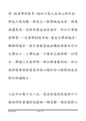 考,就會學到很多,假如只是人在而心卻不在, 那也只是白聽,對自己一點幫助也沒有,因為 我還是我,沒有改變也沒有進步,所以只要堅 持學習,一定會學到很多的,當自己學得越多、 瞭解得越多,就不會輕易地去觸犯因果而可以 大事化小、小事化無。只要自己做得對,行得 正,舉頭三尺有神明,師公都會看到的,所以 我們需要保持著良好的心態和信心堅持的走在 修行的道路上。 人生不如意十之八九,我沒有想到在我快六十 歲的時候會遇到這樣的一個災難,現在我對人 嗆浪集 33 輯 Page 373