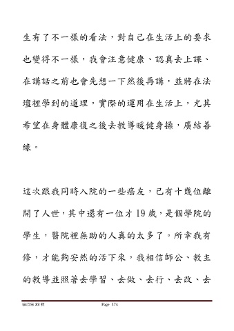 生有了不一樣的看法,對自己在生活上的要求 也變得不一樣,我會注意健康、認真去上課、 在講話之前也會先想一下然後再講,並將在法 壇裡學到的道理,實際的運用在生活上,尤其 希望在身體康復之後去教導暖健身操,廣結善 緣。 這次跟我同時入院的一些癌友,已有十幾位離 開了人世,其中還有一位才 19 歲,是個學院的 學生,醫院裡無助的人真的太多了。所幸我有 修,才能夠安然的活下來,我相信師公、教主 的教導並照著去學習、去做、去行、去改、去 嗆浪集 33 輯 Page 374