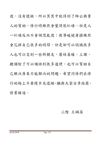 渡,沒有懷疑,所以冥冥中就得到了師公與貴 人的幫助。修行時雖然會覺得很忙碌,但是人 一忙碌反而不會胡思亂想;教導暖健身操雖然 會花掉自己很多的時間,但是卻可以認識很多 人也可以交到一些新朋友,廣結善緣。上課、 聽課除了可以領悟到很多道理,也可以幫助自 己解決原來不能解決的問題,希望同修們在修 行的路上不要慢步或退縮。願與大家分享經歷, 修業精進。 三階 王姵蓓 嗆浪集 33 輯 Page 375