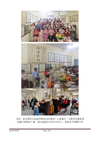 同修、氣功學員及嘉賓們參與行政覺省日上香儀式,宗教部安排組員 宣讀行政覺省日義,儀式過後共用祭品和供品,喜氣洋洋熱鬧非常 嗆浪集 33 輯 Page 386