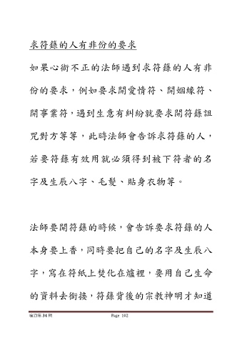 求符籙的人有非份的要求 如果心術不正的法師遇到求符籙的人有非 份的要求,例如要求開愛情符、開姻緣符、 開事業符,遇到生意有糾紛就要求開符籙詛 咒對方等等,此時法師會告訴求符籙的人, 若要符籙有效用就必須得到被下符者的名 字及生辰八字、毛髮、貼身衣物等。 法師要開符籙的時候,會告訴要求符籙的人 本身要上香,同時要把自己的名字及生辰八 字,寫在符紙上焚化在爐裡,要用自己生命 的資料去銜接,符籙背後的宗教神明才知道 嗆浪集 34 輯 Page 102