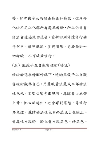 帶,能有機會及時間去修正和修改。但內丹 化法不足以化解所有魔界考驗,所以仍需靠 修法者通過深切反省,重新回到修煉修行的 行列中,嚴守規矩,參與團隊,勇於面對一 切考驗,不可放棄修行。 (三) 照鏡子及自觀審核術(發現) 修法者還在清醒情況下,透過照鏡子以自觀 審核術觀察自己,用慧眼看法藏或本部的法 性色光,當陰心魔考出現時,魔障會由本部 上升,把心部遮住,也會矇蔽思想,導致行 為失控。魔障的法性色素必然現出在臉上。 當魔性出現時,臉上會出現黑色、暗黑色、 嗆浪集 34 輯 Page 275