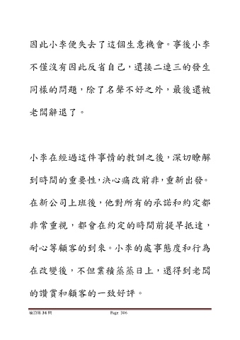 因此小李便失去了這個生意機會。事後小李 不僅沒有因此反省自己,還接二連三的發生 同樣的問題,除了名聲不好之外,最後還被 老闆辭退了。 小李在經過這件事情的教訓之後,深切瞭解 到時間的重要性,決心痛改前非,重新出發。 在新公司上班後,他對所有的承諾和約定都 非常重視,都會在約定的時間前提早抵達, 耐心等顧客的到來。小李的處事態度和行為 在改變後,不但業積蒸蒸日上,還得到老闆 的讚賞和顧客的一致好評。 嗆浪集 34 輯 Page 306