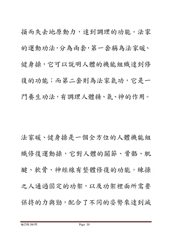 損而失去地原動力,達到調理的功能。法家 的運動功法,分為兩套,第一套稱為法家暖、 健身操,它可以説明人體的機能組織達到修 復的功能;而第二套則為法家氣功,它是一 門養生功法,有調理人體精、氣、神的作用。 法家暖、健身操是一個全方位的人體機能組 織修復運動操,它對人體的關節、骨骼、肌 腱、軟骨、神經線有整體修復的功能。練操 之人通過固定的功架,以及功架裡面所需要 保持的力與勁,配合了不同的姿勢來達到減 嗆浪集 34 輯 Page 38