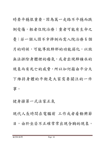時要平穩很重要,因為萬一走路不平穩而跌 倒受傷,輕者住院治療;重者可能有生命之 憂;若一個人因不幸摔倒而需入院治療 6 個 月的時候,可能導致肺部的功能弱化,以致 無法排除身體裡的癈氣,或者出現肺積水的 現象而有死亡的威脅,所以如何藉由平分天 下維持身體的平衡是大家需要關注的一件 事。 健身操第一式法家正氣 現代人長時間在電腦前 工作或者看餘興節 目,由於坐姿不正確常常出現含胸的現象。 嗆浪集 34 輯 Page 44