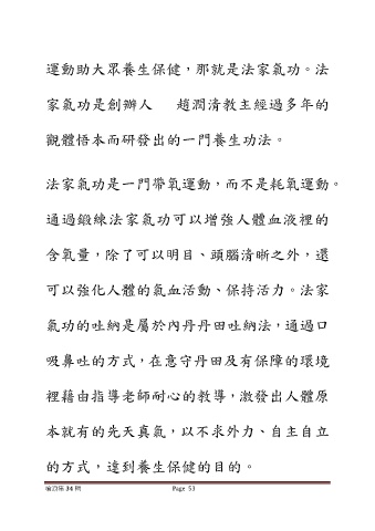 運動助大眾養生保健,那就是法家氣功。法 家氣功是創辦人 趙潤清教主經過多年的 觀體悟本而研發出的一門養生功法。 法家氣功是一門帶氧運動,而不是耗氧運動。 通過鍛練法家氣功可以增強人體血液裡的 含氧量,除了可以明目、頭腦清晰之外,還 可以強化人體的氣血活動、保持活力。法家 氣功的吐納是屬於內丹丹田吐納法,通過口 吸鼻吐的方式,在意守丹田及有保障的環境 裡藉由指導老師耐心的教導,激發出人體原 本就有的先天真氣,以不求外力、自主自立 的方式,達到養生保健的目的。 嗆浪集 34 輯 Page 53